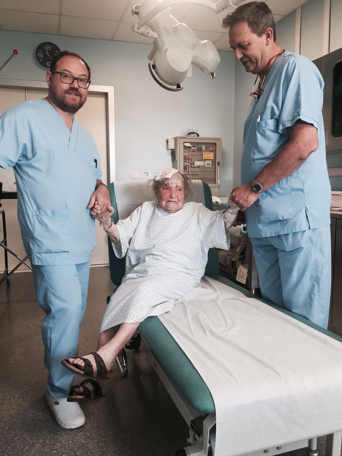 La signora, classe 1906, cesenate, è stata operata dal dottor Massimo Bassi e dal dottor Pier Renato Giacomini, chirurghi dell’equipè dell’Unità operativa di Chirurgia maxillo facciale diretta dal dottor Angelo Campabassi, per l’asportazione di un carcinoma cutaneo sulla fronte che le aveva eroso la teca cranica provocando ulcere e sanguinamento dolorosi.