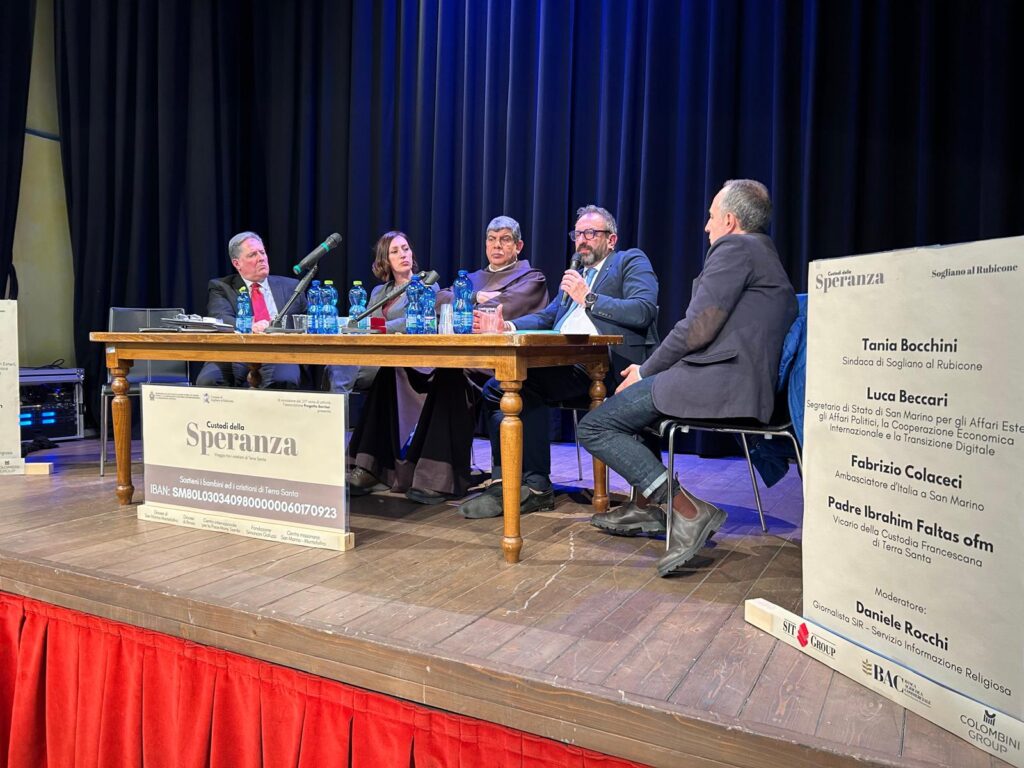 Israeliani e palestinesi che lavoravano insieme ora non si parlano più. A questo si aggiunge la distruzione a Gaza: 20mila di bambini orfani. Persone che non riconoscono più le loro città tanto sono distrutte. “Gaza è un cimitero a cielo aperto”. Padre Ibrahim Faltas riporta tutti alla realtà. Una realtà nella quale non si perde la speranza ma dove occorre fare i conti con tutto quello che è successo negli ultimi 16 mesi. Il vicario della Custodia francescana di Terra santa è stato ospite, oggi pomeriggio, a Sogliano al Rubicone, di un incontro organizzato da “Progetto sorriso” per i suoi 25 anni di attività. Presenti anche l’ambasciatore d’Italia a San Marino Fabrizio Colaceci, il segretario di Stato di San Marino per gli Affari esteri, Luca Beccari, e la sindaca Tania Boccini. L’incontro è stato moderato dal giornalista dell’agenzia Sir, esperto di Medio Oriente, Daniele Rocchi. “Progetto sorriso” è un’ organizzazione di volontariato sammarinese molto legata alla figura di monsignor Pietro Sambi, nunzio apostolico e uomo di pace soglianese.