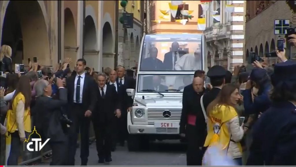 La mattina del primo ottobre 2017 ci trovammo in piazza Giovanni Paolo II all’alba, quando ancora era buio. Il coro, composto da 160 elementi, tra coristi e musicisti, era assiepato dietro le transenne, nel luogo a noi destinato, e cominciava a vivere una grande emozione. Man mano che si faceva giorno cresceva l’attesa finché si seppe che il Papa era atterrato all’Ippodromo di Cesena. Da quel momento abbiamo seguito sui maxischermi le immagini in diretta, mentre cominciavamo a cantare. A un certo punto dal crescente clamore della gente abbiamo realizzato che la ‘papamobile’ era ormai vicina, proprio quando il coro stava eseguendo ‘Vieni, qui tra noi’: qual canto più adatto?