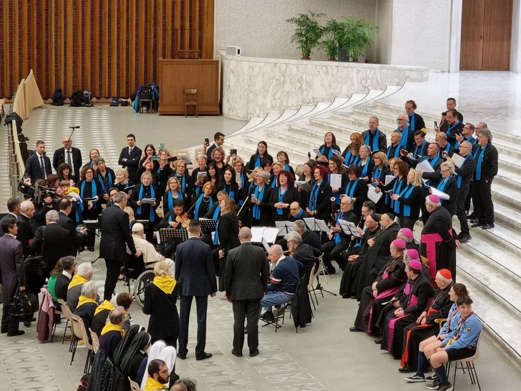 Ma come si dice dalle nostre parti: ‘non c’è due senza tre’. Ed ecco che si è prestata di nuovo una occasione, davvero speciale, per incontrarlo da vicino, lo scorso anno, in Aula Paolo VI, che è stata l’ultima volta e forse quella più forte. Il Coro Alma Canta era stato invitato ad animare la liturgia in San Pietro per il bicentenario di Pio VII, con il cardinal Gambetti. Ma qualcuno dal cielo ha voluto che ci fosse anche la possibilità di incontrare il Papa in udienza privata, con le diocesi di Cesena, Imola, Savona e Tivoli.