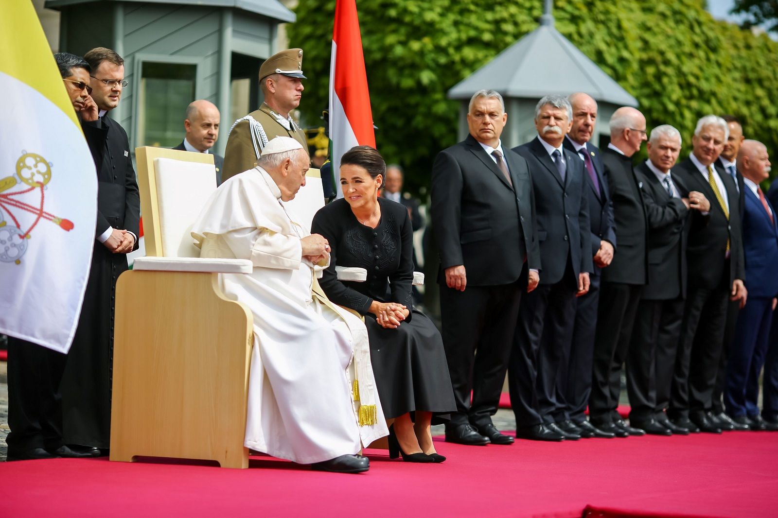 In arrivo al palazzo presidenziale su una Fiat 500, Francesco viene accolto dalla presidente Katalin Novak (qui sotto nella foto mentre dialoga con papa Francesco). Accanto a lei c’è il premier Viktor Orban che lo saluta per primo. La cerimonia è sobria e solenne al tempo stesso, con inni e parata militare. Accanto al Papa c’è il segretario di Stato vaticano, il cardinale Pietro Parolin.