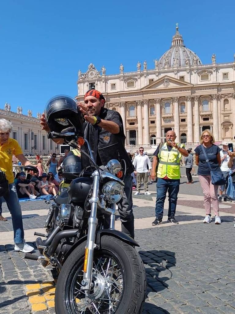 Nella foto sotto don Filippo in piazza San Pietro sulla sua moto, con il gruppo