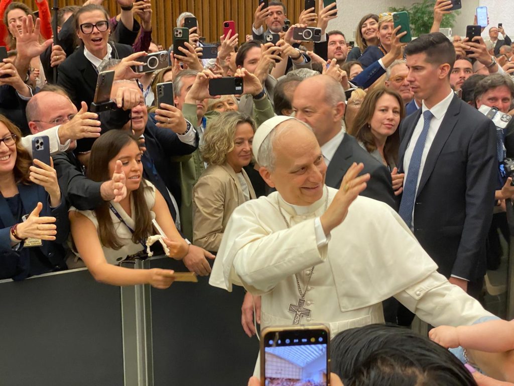 Nel saluto iniziale c’è l’emozione delle prime volte, quella che gli abbiamo visto negli occhi il giorno dell’elezione. Entra con piglio deciso, annunciato dalle guardie svizzere. Papa Francesco era entrato da quella stessa porta pochi mesi fa, in sedia a rotelle. In comune hanno i grandi temi del pontificato precedente, la pace, l’intelligenza artificiale e la sfida del tempo per la Chiesa, un pizzico d’ironia, e il desiderio di incontrare. Anche Leone XIV inizia con un “Buongiorno”, ringrazia per l’accoglienza e fa una battuta in inglese: “dicono che se ti applaudono all’inizio non vale. Se sarete ancora svegli alla fine e vorrete applaudire, bè, grazie mille”.