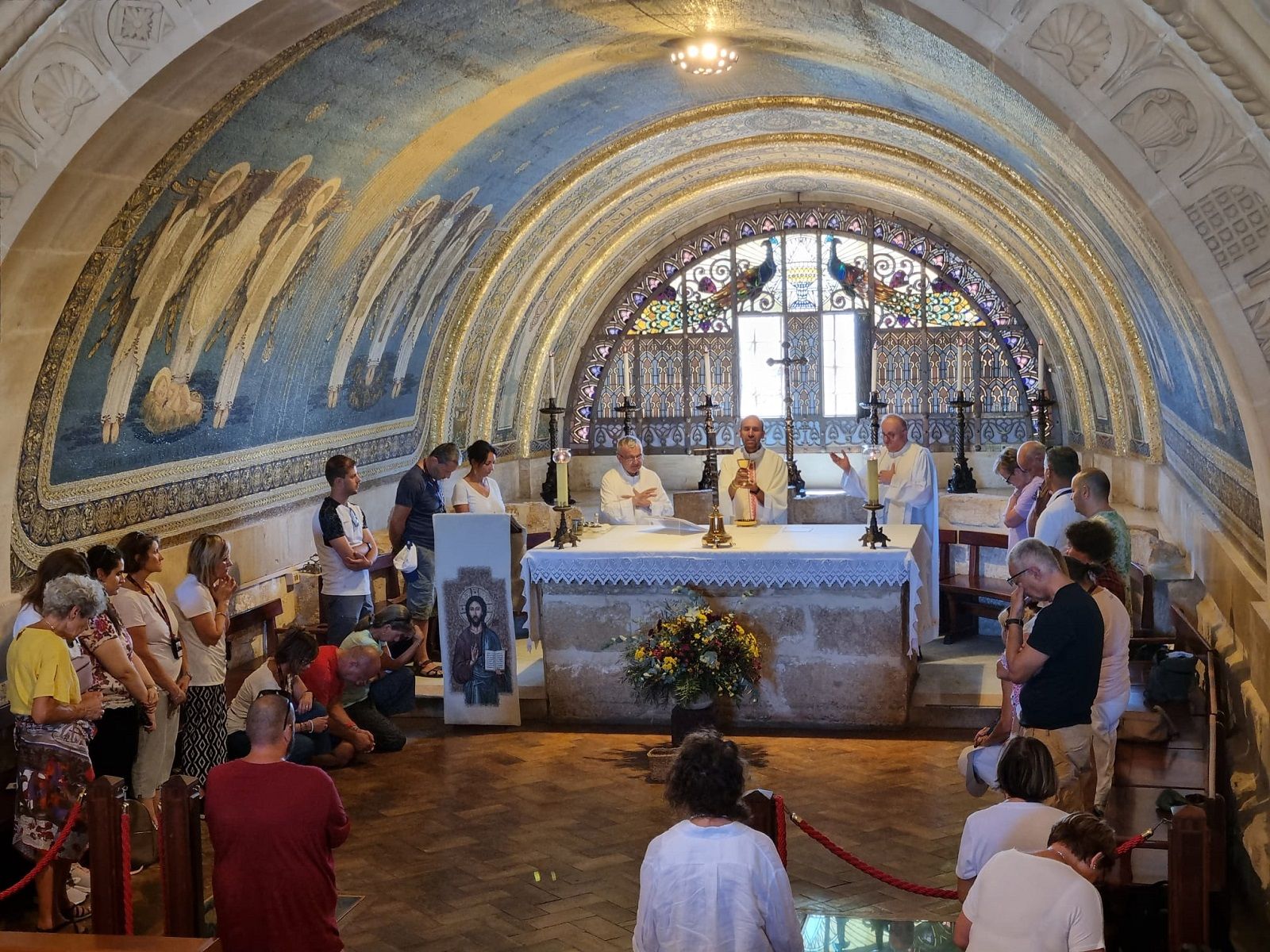 Nella basilica della trasfigurazione, il sacerdote-guida ha detto che “le trasfigurazioni nella bellezza della chiesa sono più di una: con la nascita di Gesù, nella fragilità di un bambino e qui al monte Tabor insieme a Elia e Mosè e all’agnello pasquale. Sono simboli da vedere con gli occhi della fede, che danno forza ed energia. Gesù ci fa attingere alla sua forza a ogni Messa, lì dove avviene il miracolo: un pezzo di pane e un calice di vino vengono trasformati nel suo corpo e sangue. E non ci fanno soccombere nelle difficoltà della vita. Gesù ci ha dato una capanna dove possiamo stare non come rifugio, ma come luogo dove fare esperienza della dimora di Dio, che Lui abita in pienezza: la Chiesa.. Anche quando è sottoposta a intemperie, è l’unica dove troviamo Gesù: bambino, agnello, risorto e presente nel pane eucaristico”.
