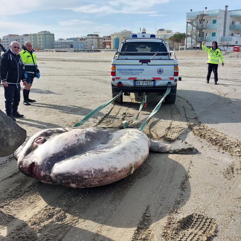 “Questa mattina sulla spiaggia di Valverde é stato recuperato il corpo spiaggiato di un pesce luna dal peso record di 1.000 chili“. Lo rende noto sui social, con tanto di foto, il sindaco di Cesenatico Matteo Gozzoli.