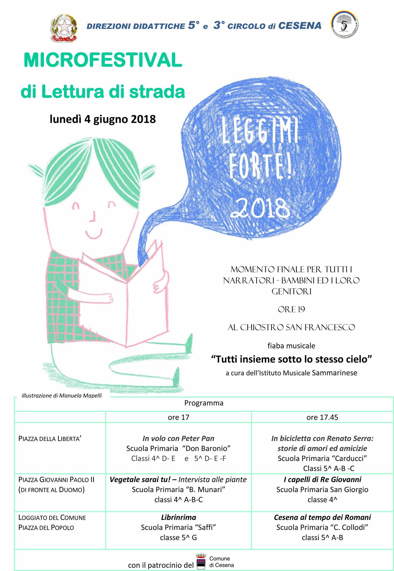 E’ il momento di “Leggimi forte 2018” il microfestival di lettura di strada organizzato dalle Direzioni didattiche del 3° e 5° circolo di Cesena, con il patrocinio del Comune di Cesena.