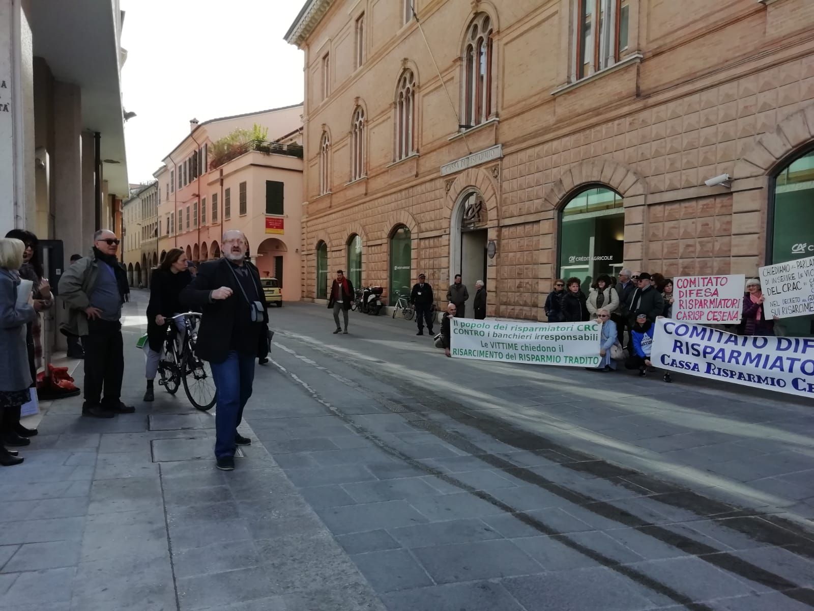 Da qualche ora il Comitato di difesa dei risparmiatori della Cassa di risparmio di Cesena manifesta davanti alla sede del Crédit Agricole a Cesena, in corso Garibaldi con striscioni e cartelli, capeggiato dal portavoce Davide Fabbri, candidato della lista civica “Cesena in comune”, munito di megafono per spiegare le ragioni del presidio.