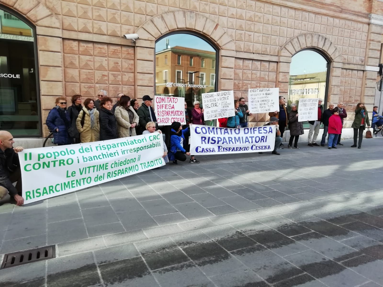 Da qualche ora il Comitato di difesa dei risparmiatori della Cassa di risparmio di Cesena manifesta davanti alla sede del Crédit Agricole a Cesena, in corso Garibaldi con striscioni e cartelli, capeggiato dal portavoce Davide Fabbri, candidato della lista civica “Cesena in comune”, munito di megafono per spiegare le ragioni del presidio.