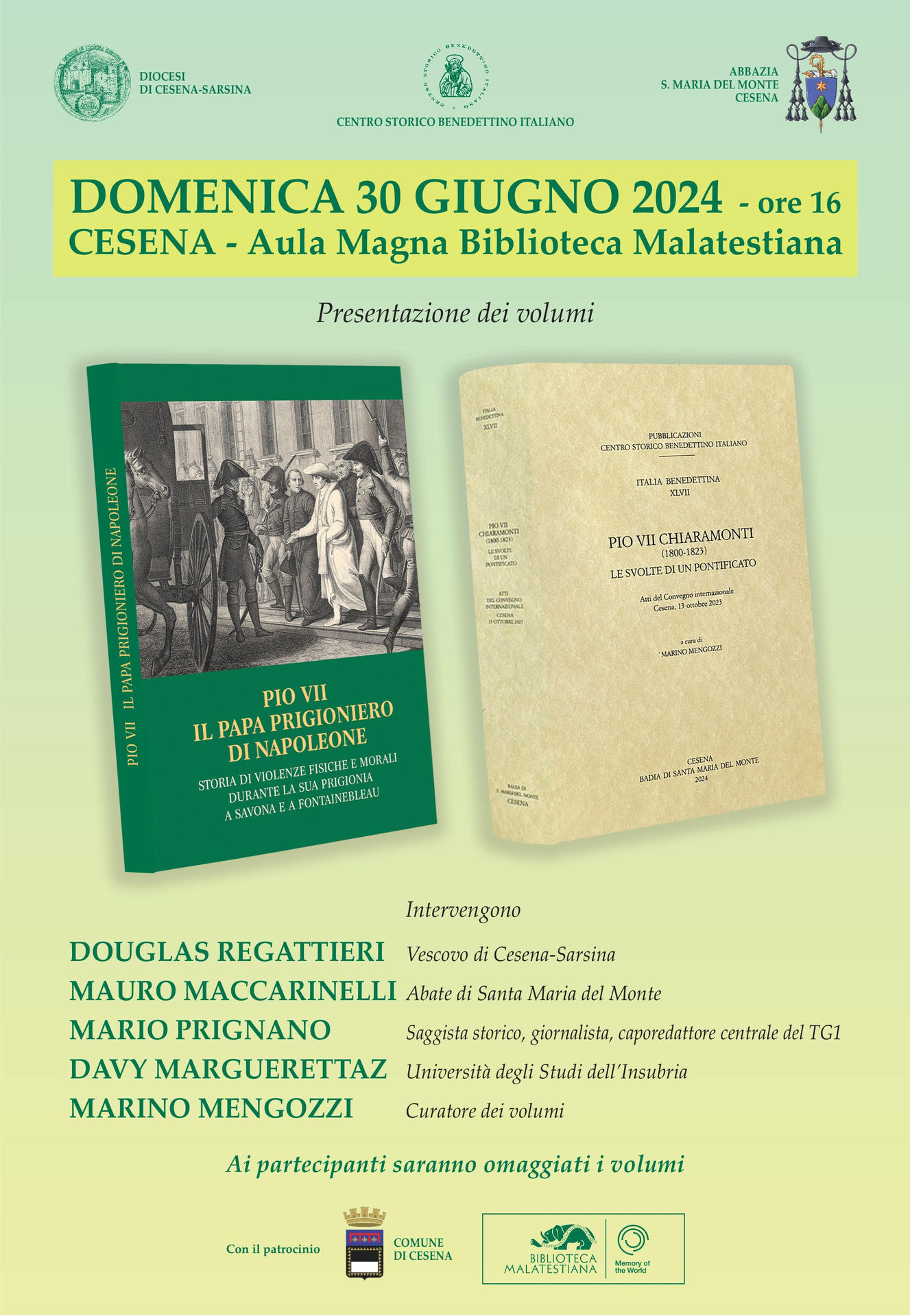 Con gli Atti, è presentato anche un volume sulla prigionia di Pio VII: un omaggio a Chiaramonti di don Silvio Bersani, l’ultimo rettore di Santa Cristina e custode del tempio di Valadier. Entrambi i libri verranno omaggiati a quanti saranno presenti.