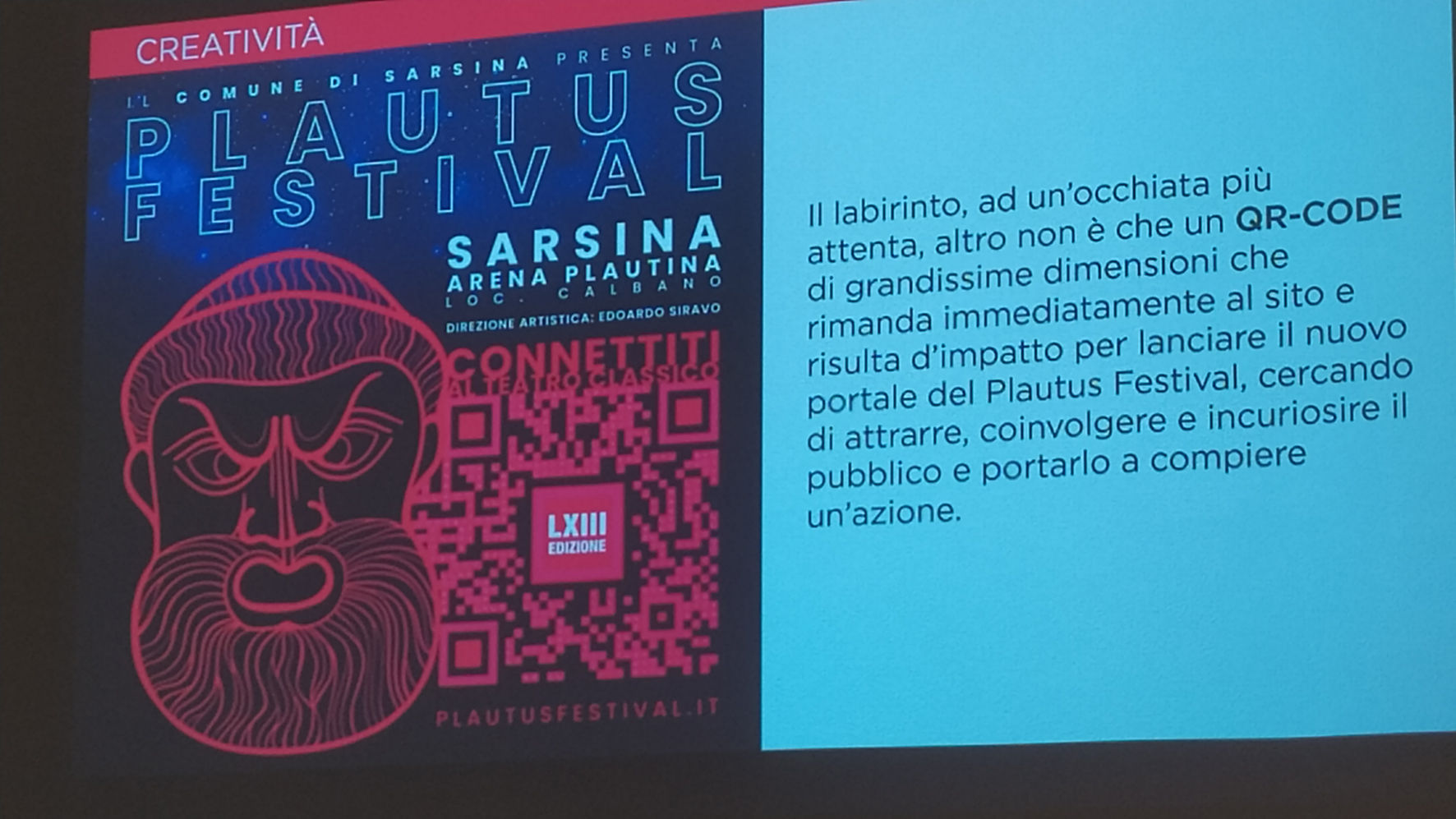 Per la sua 63esima edizione, il Plautus si veste di nuovo. È stato rinnovato il sito, a cura dei tipi della società di comunicazione “Masato”: al nero dello sfondo è associato il rosa, con un’abbinata moderna e accattivante, adeguata a un pubblico sempre più tecnologico. Gianni Bonali ha presentato la parte creativa, un concept che mixa elementi moderni a quelli classici. Il nuovo logo si presenta così con la ‘classica’ maschera sotto a un cielo stellato e al QrCode che richiama il labirinto e che ‘rimanda’ al nuovo sito www.plautusfestival.it