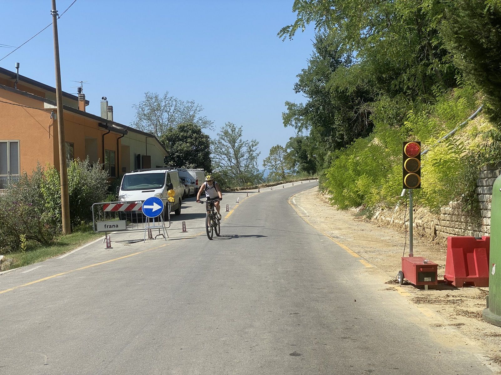 Come si vede nella foto sopra, il senso unico alternato regolato da semaforo è ancora attivo subito dopo il centro storico di Roncofreddo. Qua la situazione frane è rimasta quella realizzato subito dopo la primissima emergenza. Frane tamponate e strada rimessa in sesto per la riapertura immediata. Il resto? Null’altro, al momento.