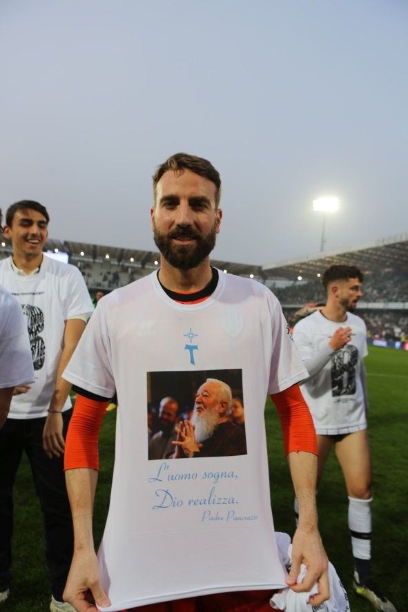 Il portiere del Cesena, Pisseri, mostra la foto di una frate cui deve molto. Pippofoto