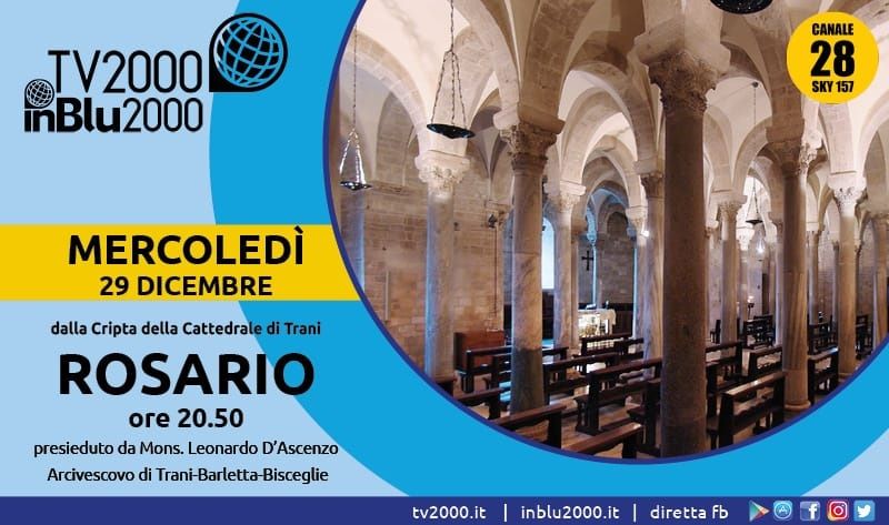 ‘Prega con noi’ di Tv2000 e InBlu2000 invitano i fedeli, le famiglie e le comunità religiose a ritrovarsi, mercoledì 29 dicembre alle 20,50, per recitare insieme il Rosario trasmesso su Tv2000 (canale 28 e 157 Sky), InBlu2000, e su Facebook. La preghiera sarà trasmessa dalla Cripta della Cattedrale di Trani, con monsignor Leonardo D’Ascenzo, arcivescovo di Trani-Barletta-Bisceglie.