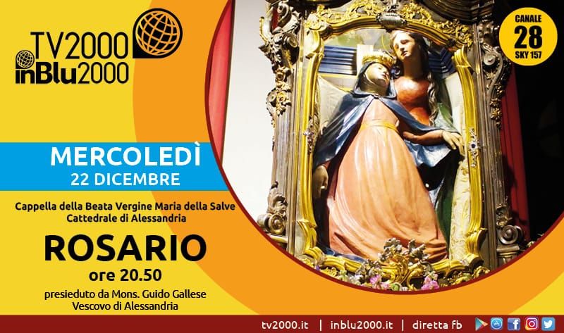 Ritorna l’appuntamento con “Prega con noi”. I media cattolici italiani invitano i fedeli, le famiglie e le comunità religiose a ritrovarsi, mercoledì 22 dicembre alle 20,50, per recitare insieme il Rosario trasmesso su Tv2000 (canale 28 del digitale terrestre e 157 di Sky), radio InBlu2000, e su Facebook.