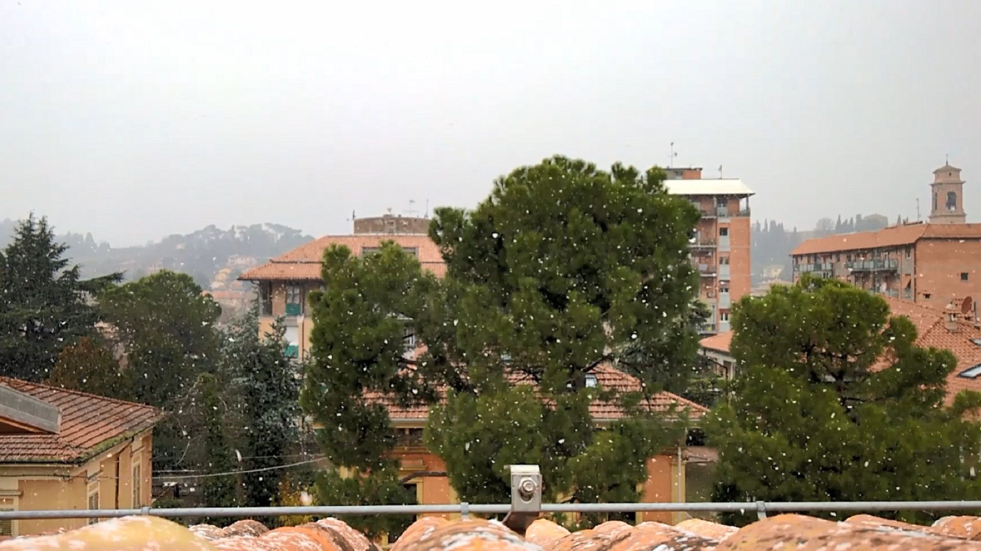 Fiocchi di neve nella mattinata di mercoledì 20 dicembre 2017 sulla città di Cesena.