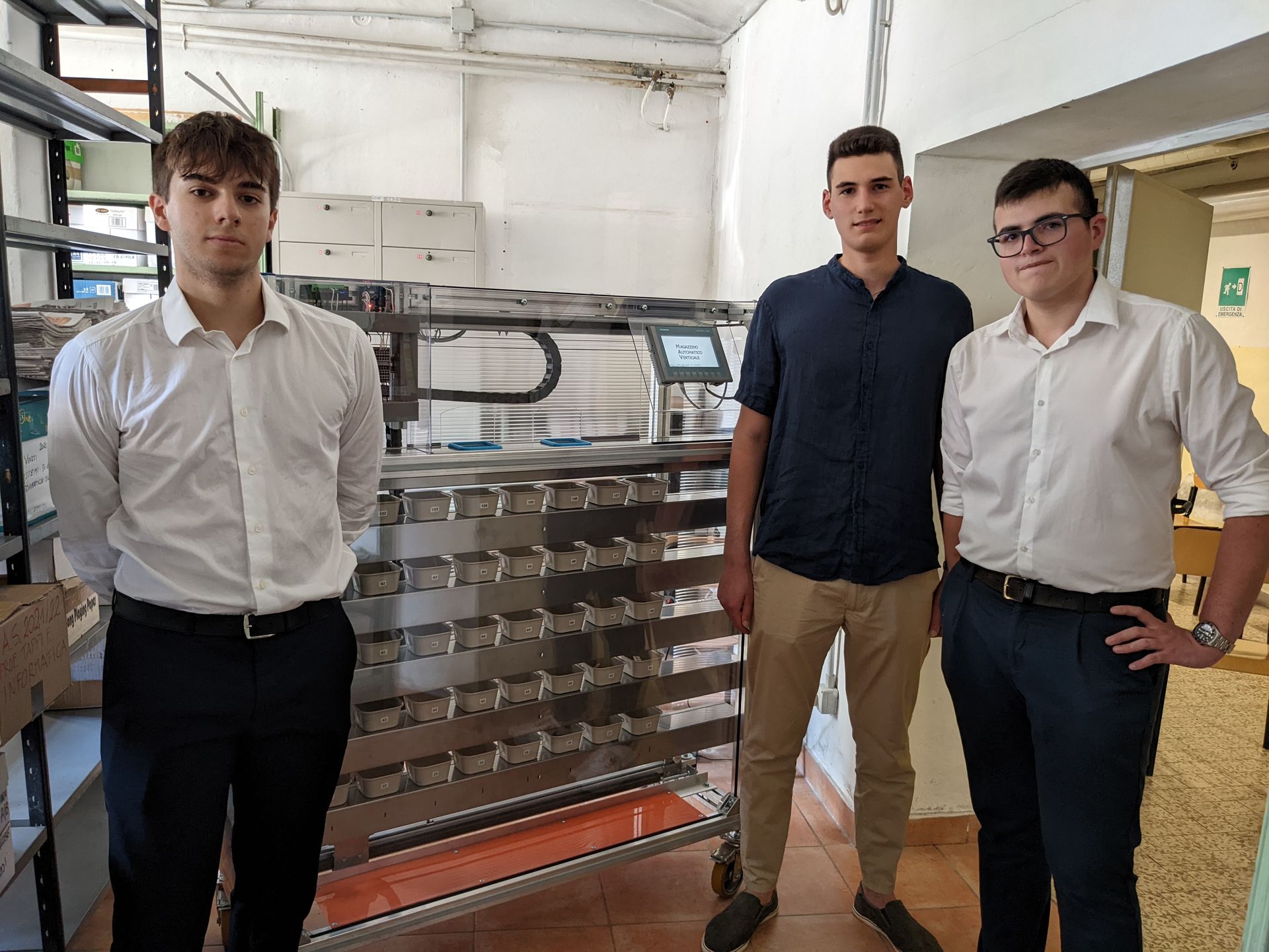Tre studenti del “Pascal” di Cesena – Giulio Zanelli, Giacomo Carloni e Luca Vitali – hanno progettato e realizzato un magazzino automatico verticale, una soluzione tecnologicamente avanzata nel campo dell’automazione per lo stoccaggio di prodotti. La macchina permette di prelevare e riporre un gran numero di prodotti in maniera completamente automatica. La selezione avviene attraverso un pannello touchscreen, mentre il trasporto dal magazzino all’area di carico e scarico è affidata a un carrello robotizzato.