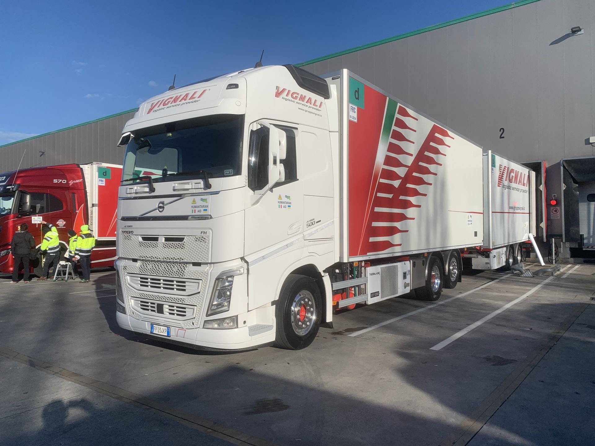 Nella foto qui sopra i tre Tir di Vignali e uno della Polo pronti per la partenza nel parcheggio della ditta Vignali, a Capocolle di Bertinoro.