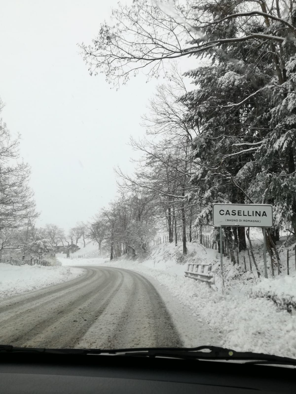 È tornata la neve in gran parte della Valle del Savio. Questa mattina così si presentava San Piero in Bagno, poco prima delle 7.