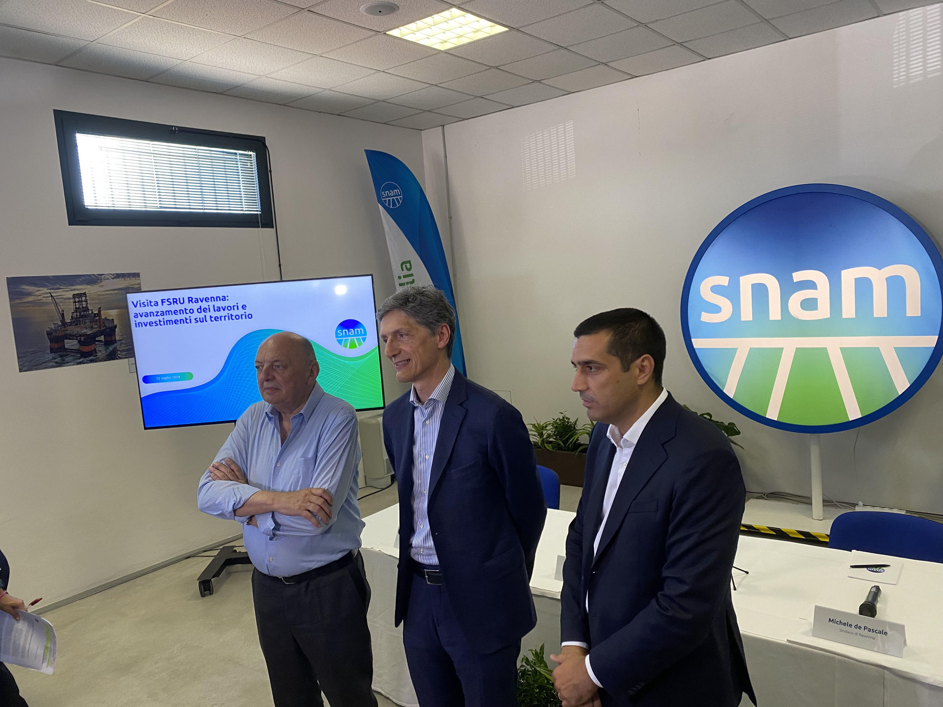 Sulla tempistica, spiega Snam, è già stato realizzati il 90 per cento delle opere a terra. “La piena operatività dell’unità rigassificatrice è prevista per il 31 marzo 2025 – dice l’amministratore delegato di Snam Stefano Venier (al centro nella foto qui sotto) -. e permetterà al Paese di arrivare al 40% di autonomia energetica sul gas”. Entro il 2026 verrà realizzata una diga per proteggere la piattaforma dalle onde.
