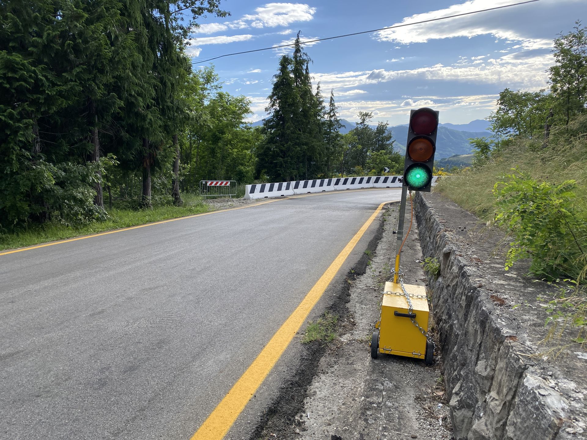 La tratta del passo del Carnaio (760 metri sul livello del mare) venne ripristinata lo scorso agosto e oggi ci sono ancora le cicatrici di quella profonda ferita che resta a cielo aperto. Come si può notare dalle foto, la voragine è ancora lì al suo posto, la strada invece è stata “spostata” più a monte, tagliando una parte del versante dove prima sorgeva un piccolo bosco. Protetta da un lungo cordone di new jersey in cemento, la carreggiata è però percorribile a senso alternato grazie a un impianto semaforico temporaneo.