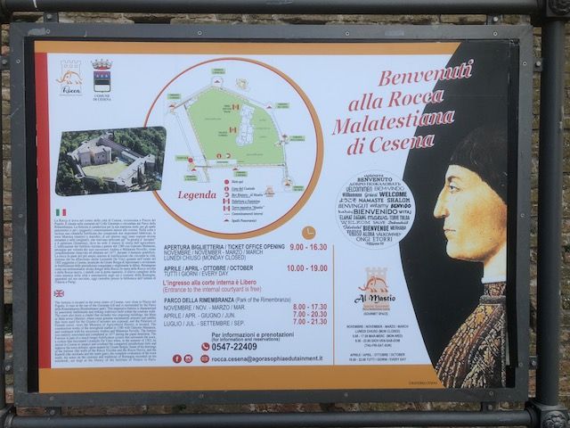 Gli Aidoru puntano il dito anche sui pannelli informativi sparsi nei vari accessi al Parco: “La cartellonistica oggi presente è ancora quella della vecchia gestione: la nostra, oramai ridotta in condizioni pessime. Ci sono stati tentativi forse poco efficaci di coprire i vecchi riferimenti telefonici che purtroppo appaiono in trasparenza, ecco forse il motivo per cui ancora oggi riceviamo telefonate di turisti che incontrano difficoltà a raggiungere la rocca o che tentano di interpretare i vecchi pannelli per sapere se, una volta scalato il Colle Garampo, troveranno poi aperta la struttura. Arrivati in cima al colle, passando dal lato di via Malatesta Novello, ci si trova di fronte invece un nuovissimo pannello informativo, che però presenta un particolare davvero singolare. Ad accoglierci alla Rocca di Cesena abbiamo una grande immagine di Sigismondo Pandolfo Malatesta, signore di Rimini, nel celebre ritratto di Piero della Francesca, che potrebbe effettivamente sviare un possibile cultore della nostra storia locale (oltre che dare un’immagine non propriamente professionale per via dell’immagine sgranata). Avremmo consigliato un Galeotto Malatesta, oppure un Novello Malatesta in quanto testimonial, si può dire “ad honorem”, della gloriosa dinastia cesenate dei Malatesta, oppure simpaticamente, anche per fornire un primo input sulle vicende che hanno interessato la nostra città e la nostra rocca, un Leonardo da Vinci o un Cesare Borgia come testimonial inconsapevoli migliori”.