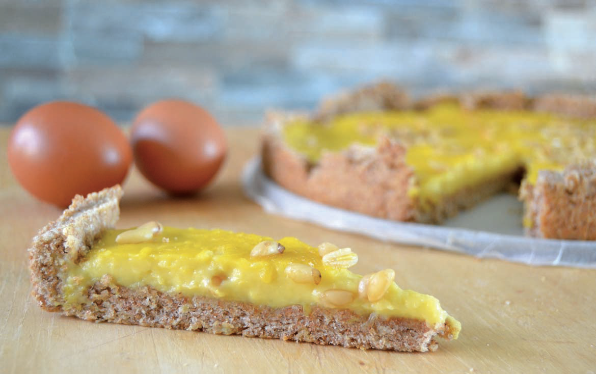 Stendere la frolla e metterla nello stampo. Bucare sia il fondo sia i bordi e cuocere a 180 gradi, forno statico. Dopo circa 15 minuti, quando sarà leggermente dorata, aggiungere la crema e i pinoli e far cuocere altri 10 minuti.
