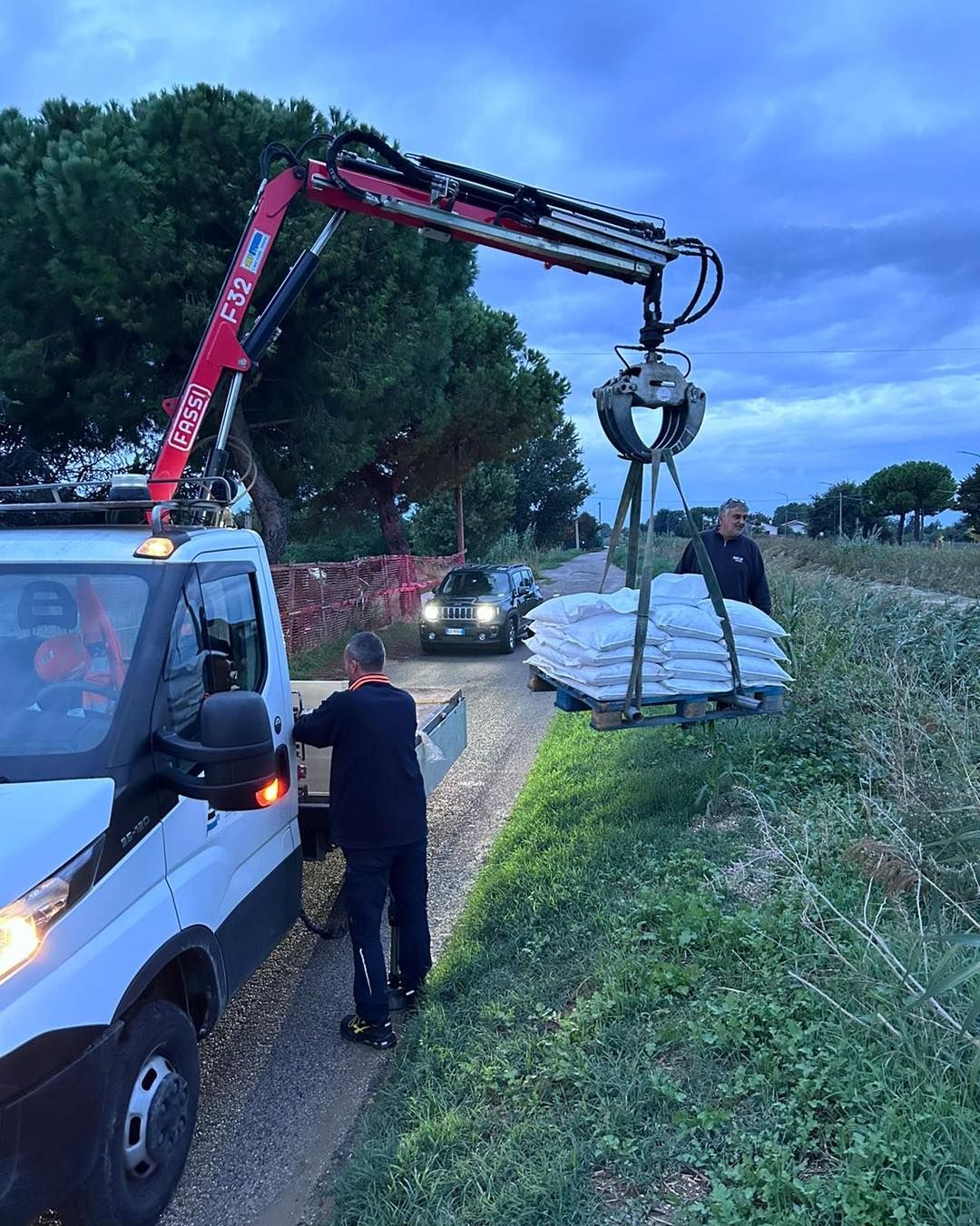 Sala di Cesenatico, sacchi di sabbia lungo gli argini