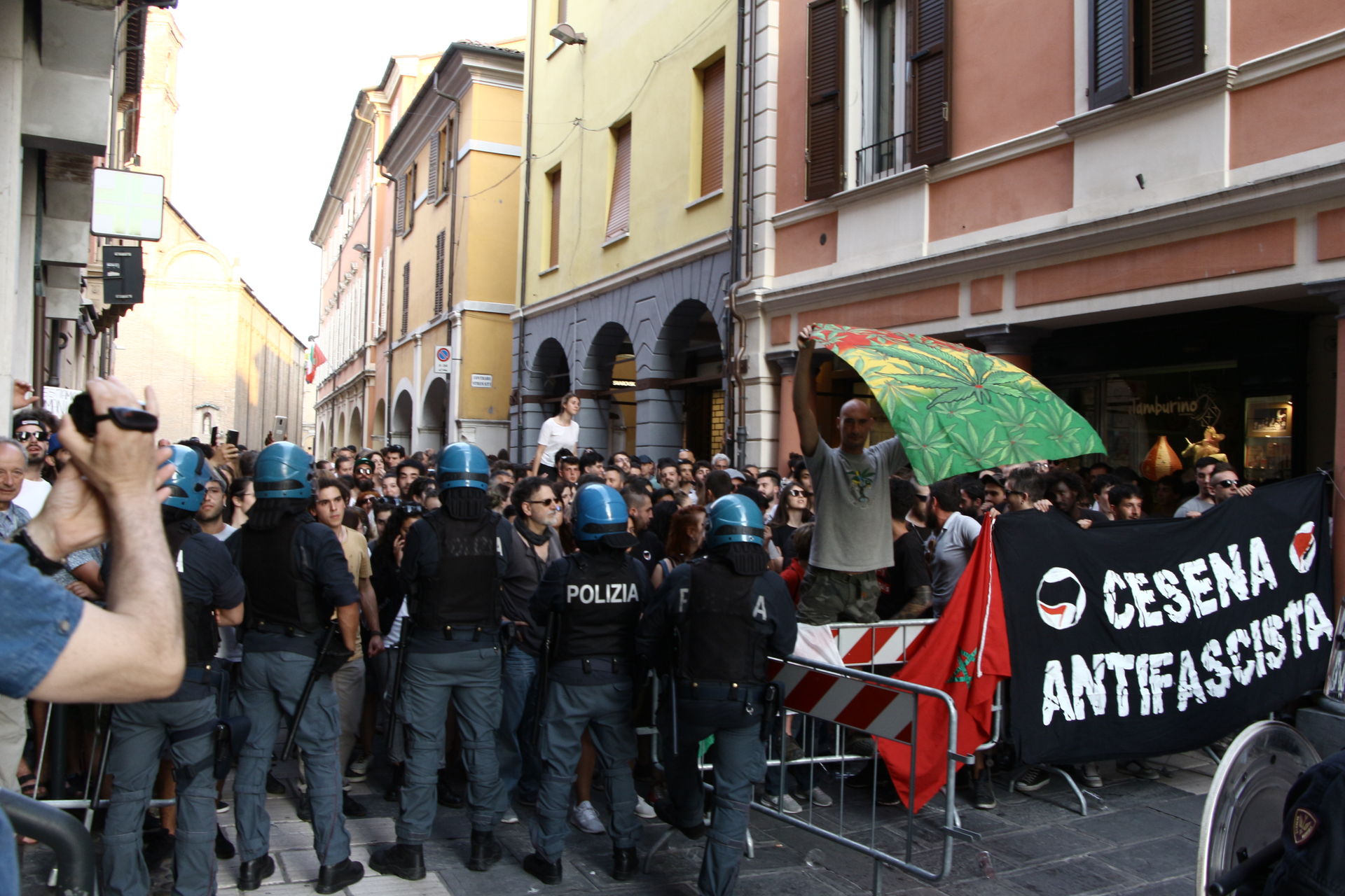 Il segretario leghista ha subìto nei primi minuti d’intervento una pesante contestazione da parte di “gruppi antagonisti” (vicini al mondo dei centri sociali) riuniti sotto lo striscione “Cesena antifascista” dal lato di Corso Mazzini che volge verso via Strinati. Si sono sentiti persino cori inneggianti a piazzale Loreto.