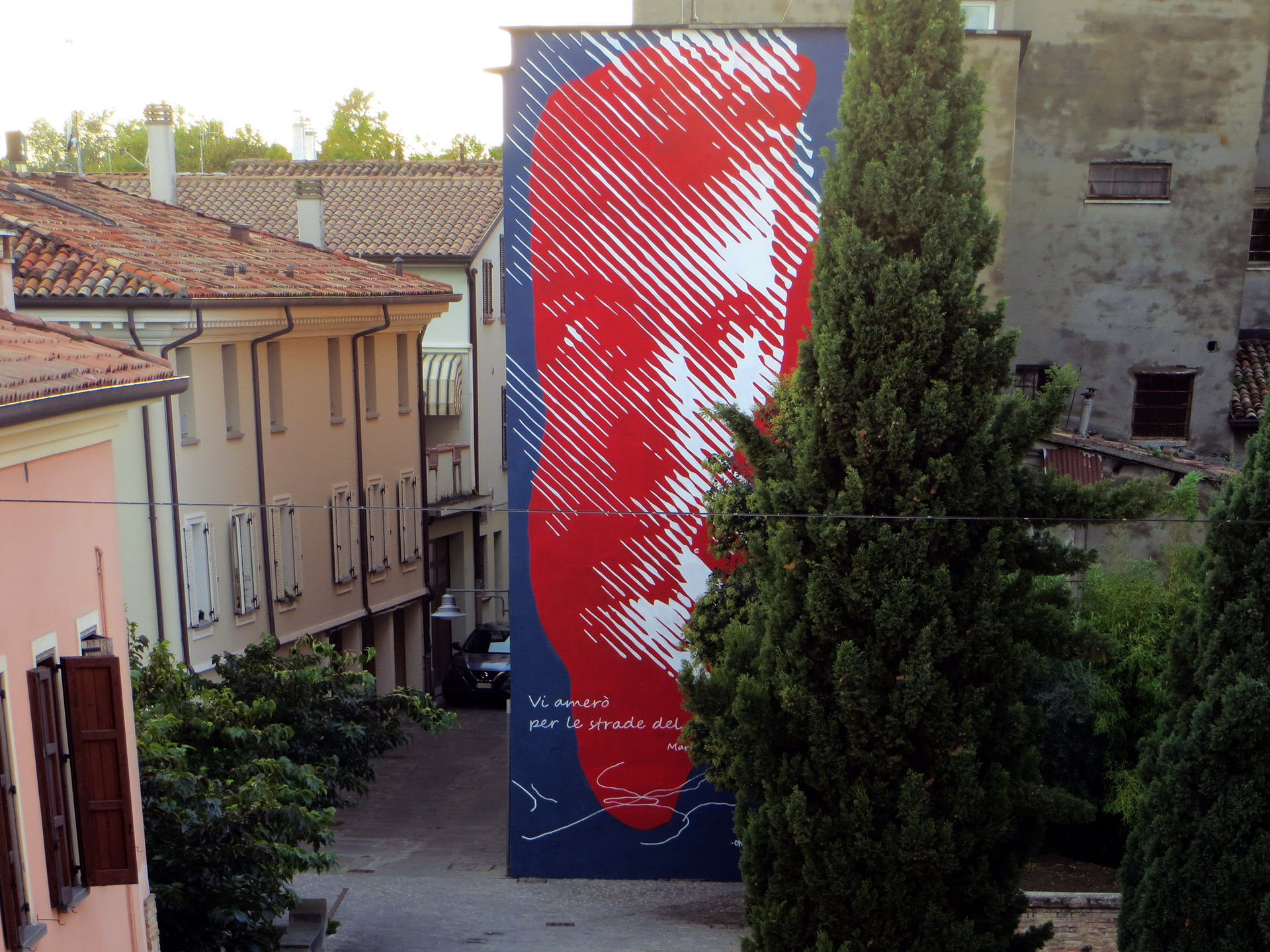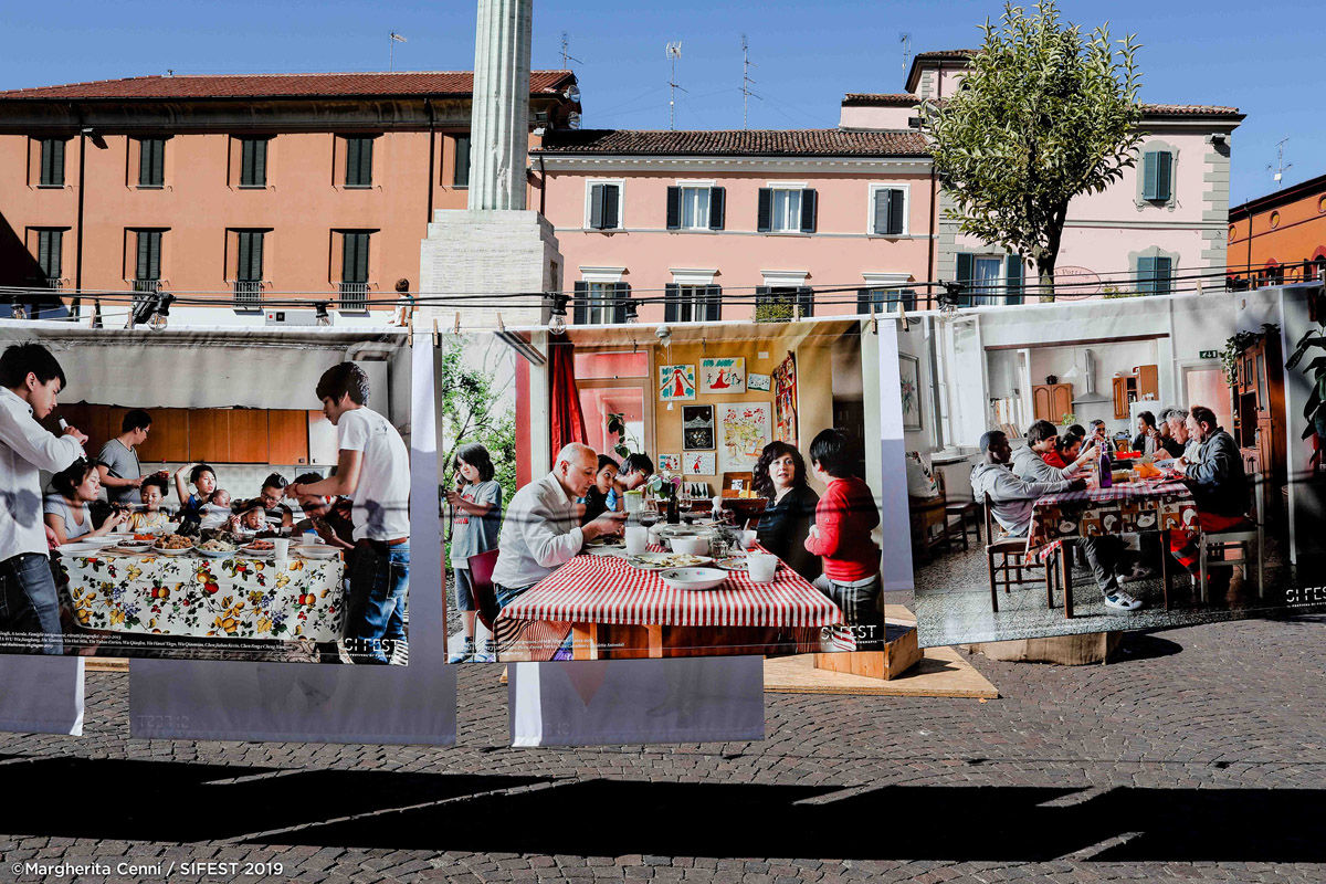 Nelle fotografie  qui sotto un’immagine del festival 2019 e il murales visibile nel centro storico di Savignano sul Rubicone dedicato a Marco Pesaresi, esempi di come la città “si cuce la fotografia addosso” portando le fotografie fuori dalle sale e dagli archivi ed esponendole in città, a portata di sguardo.