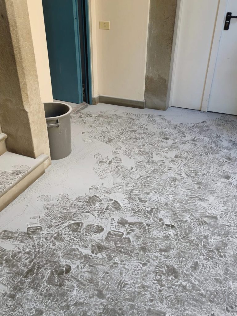 Banchi accatastati e scritte sui muri. Il danno maggiore è dato dalle polveri dell’estintore aperto