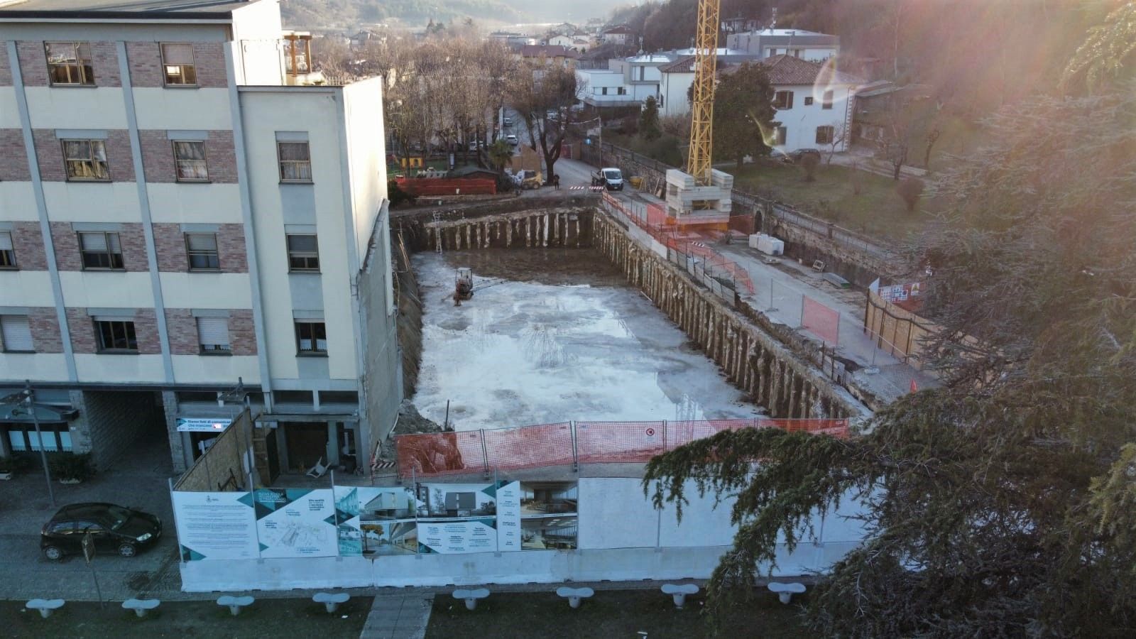 A seguire, è stata “portata a termine l’escavazione di profondità di 5 metri estesa a tutta l’area di insediamento del nuovo edificio, che è stata preceduta dalla posa di 90 micro-pali in cemento armato di profondità di 15 metri lungo il perimetro a monte dello scavo”.