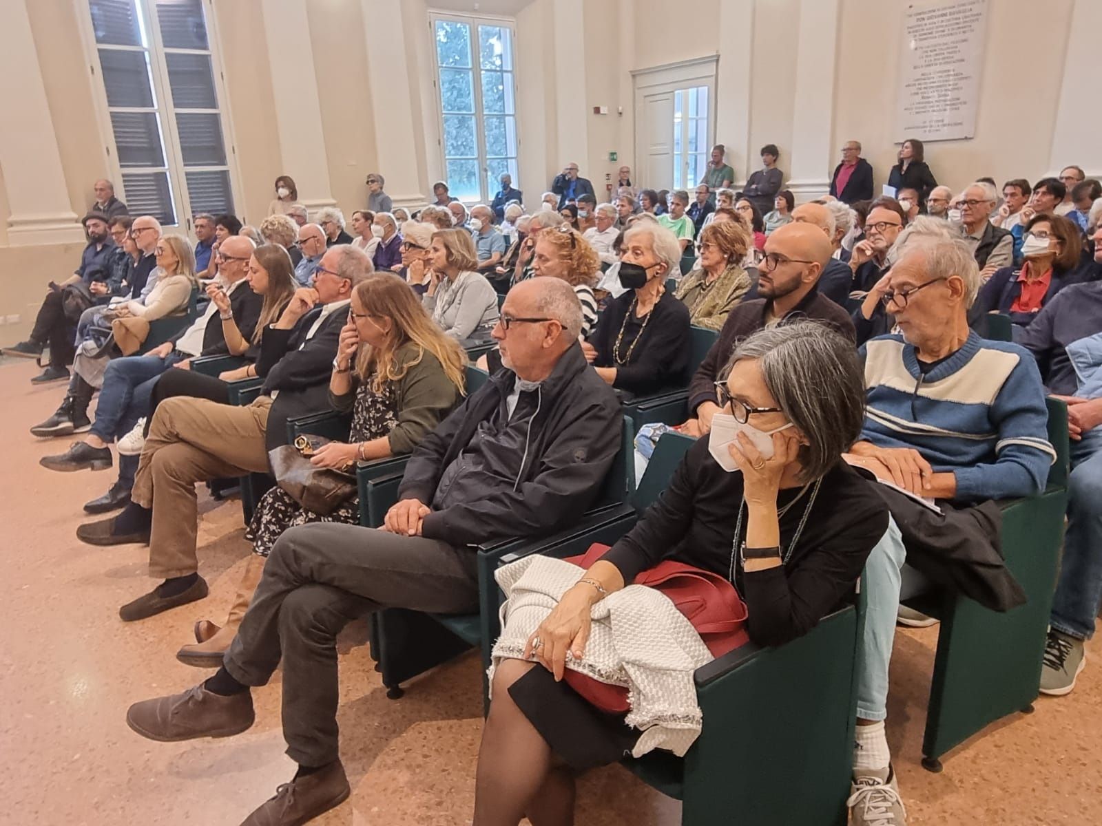 L’aula magna della Malatestiana oggi pomeriggio gremita di gente. Foto Sandra e Urbano, fotografi a Cesena. Il secondo, da destra in prima fila, è l’assessore Carlo Verona.