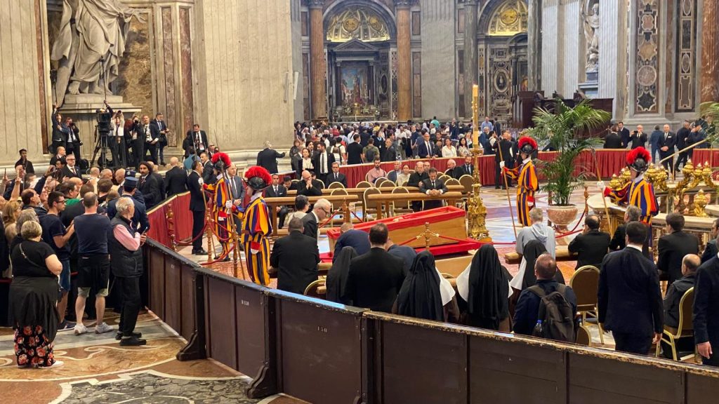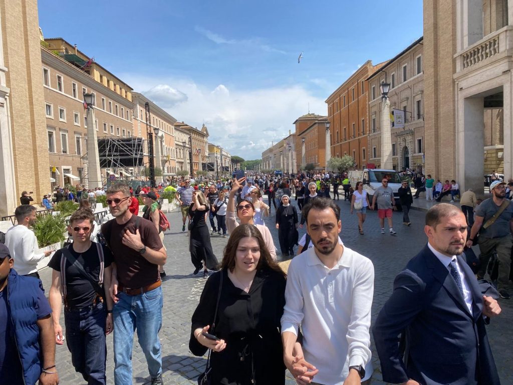 “In basilica – riferisce il direttore – molto silenzio, anche incredulità, per una morte arrivata improvvisa, dopo l’uscita in piazza del giorno di Pasqua. Via della Conciliazione è piena di gente. Tanti i giovani. Gli unici rumori sono quelli degli operai che stanno allestendo il sagrato per i funerali di sabato 26 aprile”.