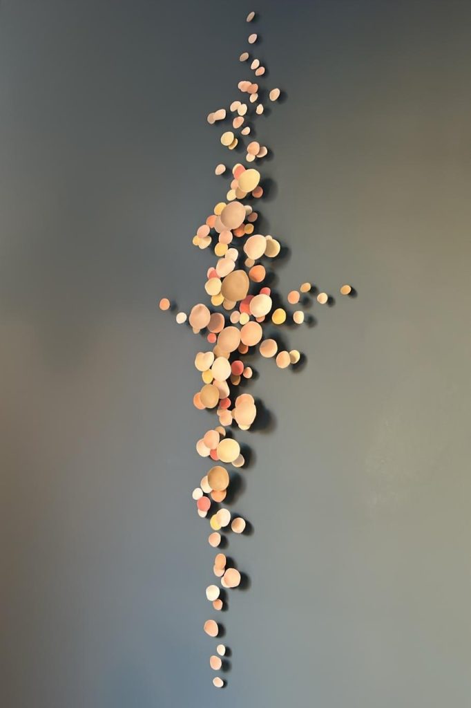 Lavori profondamente personali che raccontano una parte della storia dell’autrice. Le relazioni, le scelte personali, le aspettative sociali, la perdita, il conflitto, il caso, la malattia o le decisioni piovono tra una giornata e l’altra, costanti e inesorabili come in “Ants Marching”, in cui l’artista assembla migliaia di piccoli segmenti ottenuti da colombini di porcellana.