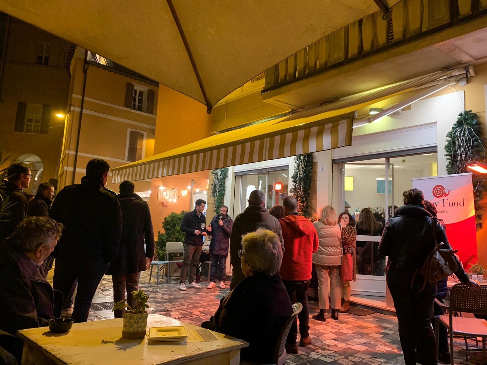 L’aperitivo, grazie al prezioso contributo di Baricentro e Gin Primo, è stata anche l’occasione per assaporare e valorizzare prodotti eccellenza del territorio: Gabriella Fabbri con la figlia Veronica e il marito Claudio Biagiarini di Baricentro aveva preparato tortelli alla lastra, raviggiolo, salame e gin tonic con il Gin al sale di Romagna di Federico Lugaresi.