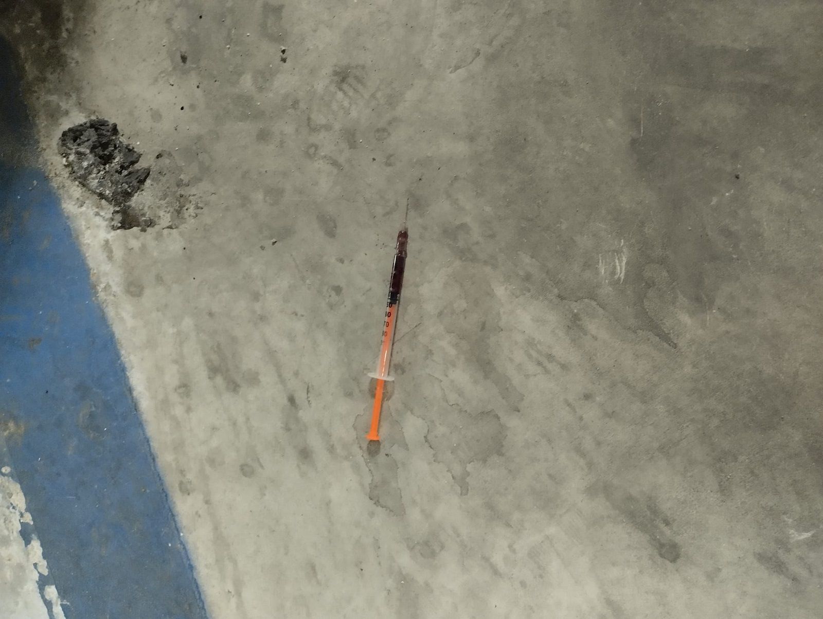 La foto in alto mostra una siringa a terra appena usata e sporca di sangue. La foto qui sotto sporcizia diffusa dove dovrebbe esserci un parcheggio. Altre foto che non pubblichiamo mostrano escrementi umani. Le segnalazioni a chi di dovere sarebbero già state inviate.