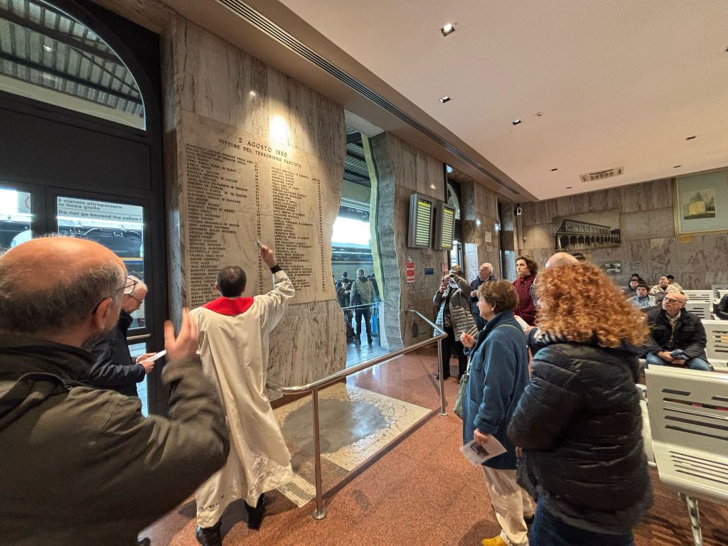 Dopo un primo momento nella cappella della stazione, don Marco ha benedetto la stele che, sempre in stazione, ricorda il sacrificio del ferroviere Silver Sirotti. Poi tutti insieme, con consiglieri e iscritti dell’associazione ci si è spostati sul primo binario dove si è pregato davanti alla lapide benedetta da Giovani Paolo II e poi nella sala d’attesa della stazione.