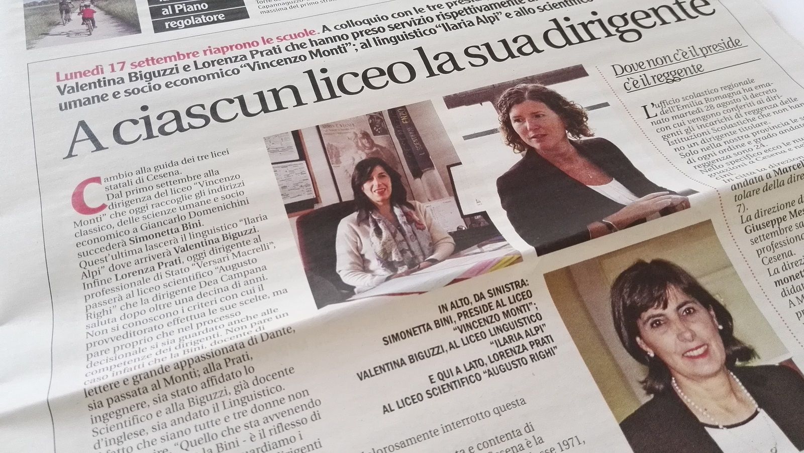 Abbiamo paarlato con Simonetta Bini, insegnante di lettere e latino e appassionata di Dante, che dal primo settembre condurrà il liceo “Monti” che contiene lo storico “liceo classico” della città; con Lorenza Prati, ingegnere, che sarà alla guida dello Scientifico “Righi”, l’istituto più grande della provincia di Forlì-Cesena, con una sede distaccata a Bagno di Romagna; e con Valentina Biguzzi, docente di lingue straniere, a cui è stato affidato il liceo più nuovo di Cesena, il linguistico “Alpi”.