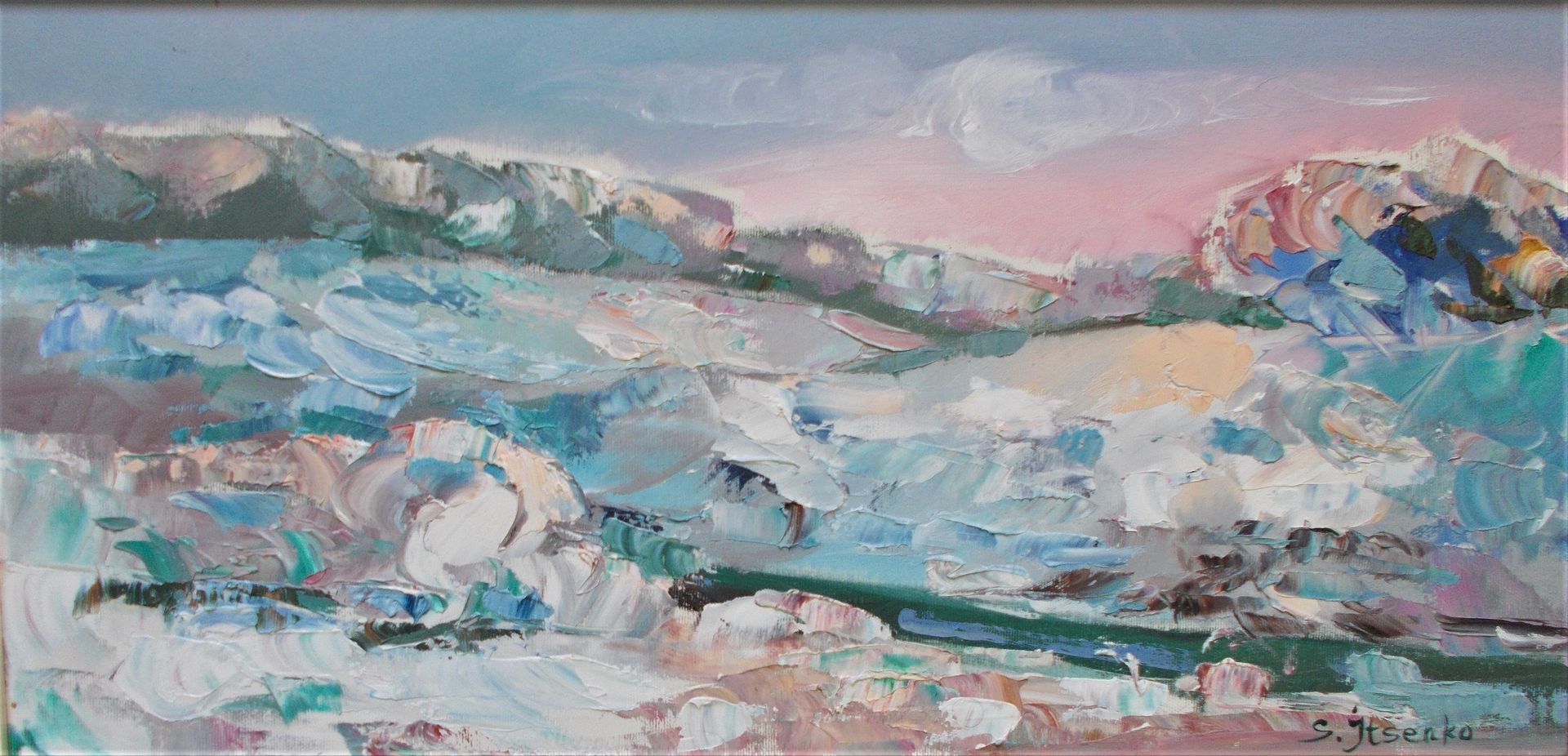 La matericità della superfice pittorica rende dinamico il paesaggio, uno scorcio campestre innevato, ove si intravvede un ruscelletto, illuminato da un pallido sole d’ aurora. E’ visibile la gestualità della pennellata, il colore che si fà denso, come su una tavolozza. Questa caratteristica della pittura della Itsenko, la avvicina all’ Informale, così che nella sua pittura suggerisce un Ultimo Naturalismo colorista.