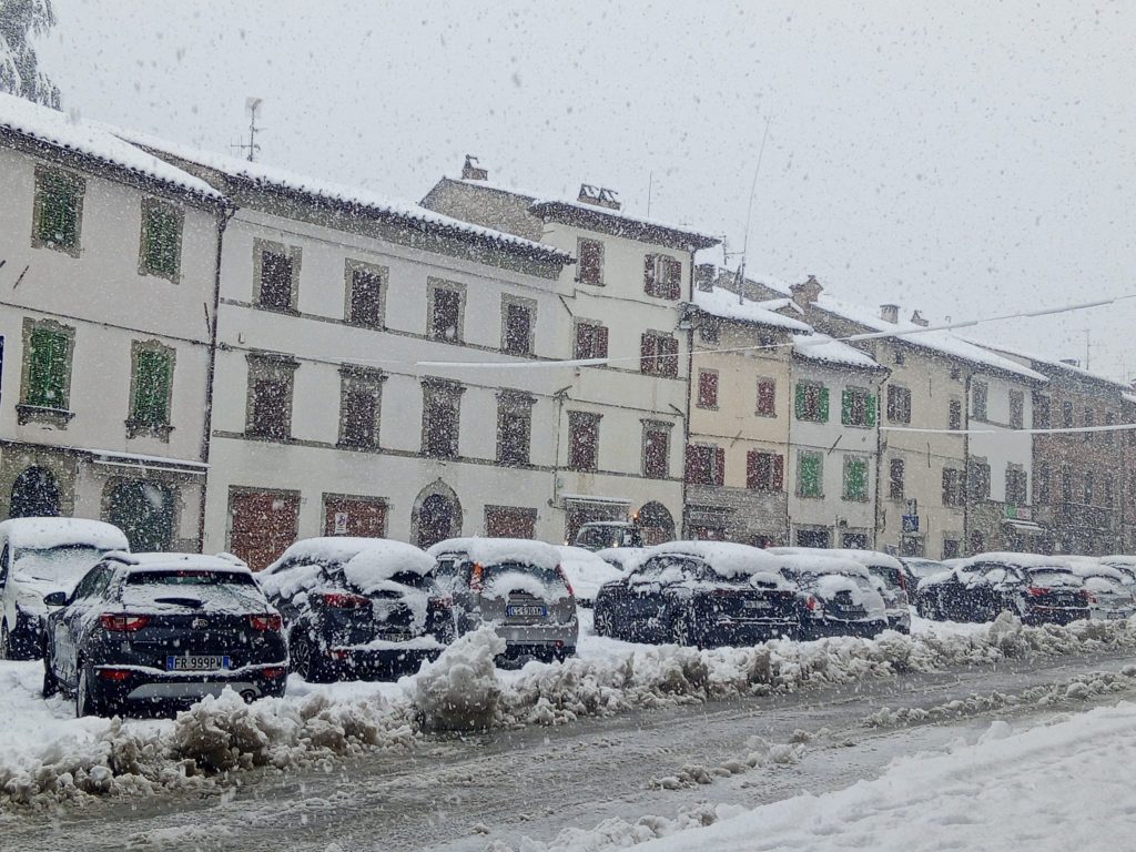 Neve, tanta, in Valle del Savio. Neve e vento, “una vera bufera. E anche le campane del paese hanno un suono diverso, sordo e cupo. Mai successo”, come ci riferisce un’abbonata di San Piero in Bagno.