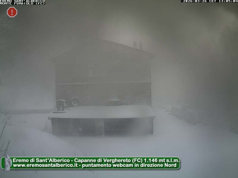 Nella foto sotto, la web cam dell’eremo di Sant’Alberico offuscata da neve e vento.