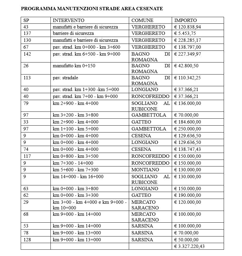 I primi interventi in corso di realizzazione sono il rifacimento della pavimentazione stradale del tratto della Sp 142 “Mandrioli” compreso tra le progressive chilometriche 6+500-9+000 (unica strada chiusa) e il rifacimento della pavimentazione stradale del tratto della Sp 9 “Cesena – Sogliano” compreso tra le progressive chilometriche 15+000 -16+000, in località Bagnolo. A seguire, sempre sulla Sp 9, dal km 16+000 al km 17.000, si procederà al rifacimento della pavimentazione della discesa della “Ciocca” e al risanamento di alcuni tratti della Sp 85 “Fondovalle Rubicone”.