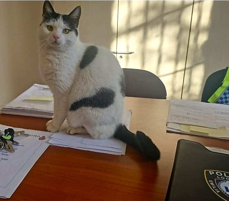 Una presenza speciale che accompagna le giornate del personale in forza al Comando: una micia che si è presentata spontaneamente presso la sede, scegliendola di fatto come propria casa e che gli agenti hanno accolto. È stata chiamata Tea, per un simpatico gioco di parole legato al nome del Comune di Gatteo, e nel tempo è diventata parte integrante della quotidianità degli operatori. “La gatta – fanno sapere gli agenti – gravita spesso attorno ai veicoli di servizio, quasi a voler svolgere una simbolica attività di vigilanza, e all’interno degli uffici ha il suo punto ristoro, una lettiera e una sedia a lei dedicata. Tea dopo aver salutato il personale osserva ogni giorno il lavoro degli agenti e sembra studiare le carte negli uffici”.