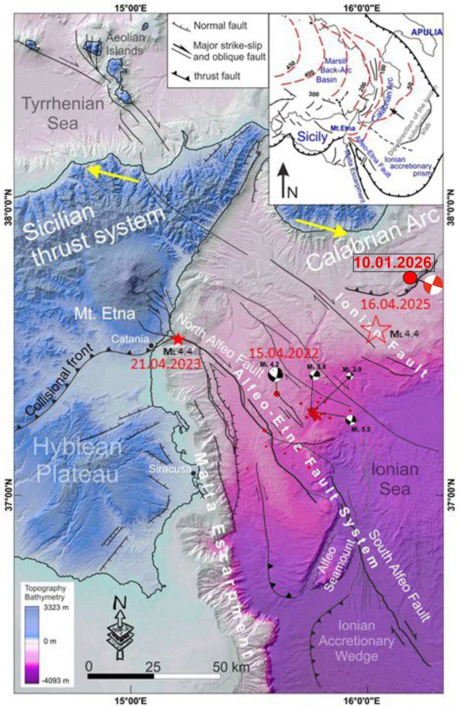 Le suddette contraddizioni ci costringono a cercare altre sorgenti sismogenetiche, in altre parole strutture tettoniche che abbiano potuto generare il sisma in oggetto. In base a quanto riportato da studi recenti condotti nel Mar Ionio occidentale, a circa 50 km verso sud-ovest si trova un’altra importante struttura tettonica attiva nota ai geo-scienziati come “Ionian Fault” (Polonia et al., 2016; figura. 2). Si tratta di un esteso sistema di faglie trascorrenti destre che – ha concluso Monaco – con direzione NO-SE, limita verso sud la placca ionica in subduzione, penetrando nell’entroterra siciliano a sud dello Stretto di Messina e propagandosi fino alle isole di Vulcano e Lipari nel Mar Tirreno meridionale. Anche se il meccanismo focale del terremoto del 10 gennaio 2026 è compatibile con la cinematica della Ionian Fault, questa struttura si trova ad una certa distanza dall’evento che invece sembra ubicato all’interno della placca in subduzione. Considerato che l’avanzamento dell’arco calabro verso il bacino ionico è influenzato da numerose strutture trascorrenti, il terremoto profondo in oggetto potrebbe suggerire che la placca ionica si stia lacerando e frammentando lungo il suo bordo sud-occidentale mentre si flette verso il basso e scende al di sotto del blocco Calabro-Peloritano“.