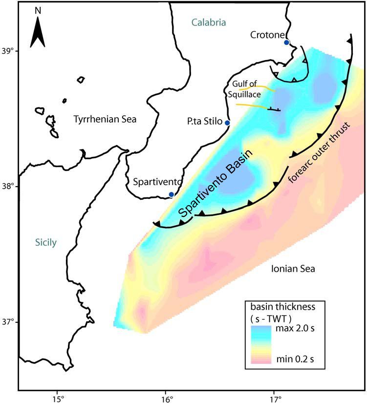 L’evento sismico ricade in una zona del bacino ionico caratterizzata dal fronte di un grande sovrascorrimento (figura 2) appartenente al fronte dell’Arco Calabro in avanzamento verso il bacino ionico la cui porzione litosferica va in subduzione verso Ovest-Nord Ovest al di sotto del blocco calabro-peloritano e del Mar Tirreno. Si tratta di un’importante struttura geologica ubicata al largo della costa ionica della Calabria meridionale, che limita verso sud-est il bacino sedimentario di avanarco di Capo Spartivento (figura 3) ”.