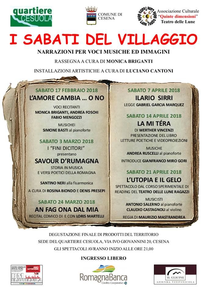 La serata, ad ingresso libero, è realizzata da Quartiere Cesuola, in collaborazione con il Comune di Cesena, l’Associazione Culturale “Quinte dimensioni” Teatro delle Lune, BM Eliotecnica, Romagna Banca Credito Cooperativo, Il Glicine Azienda Vitivinicola.
