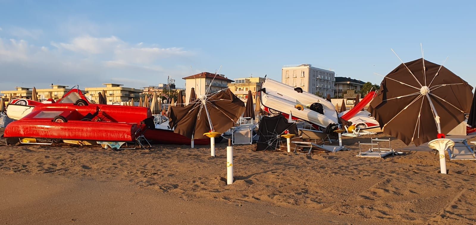 Le foto ci sono state inviate dall’amico/lettore Massimiliano Turci. Mostrano i danni causati sulla spiaggia. Lettini, ombrelloni e pedalò sbattuti ovunque dalla forza del vento. La zona è quella del bagno Thaiti e della spiaggia libera davanti al parco acquatico Diamanti beach village.