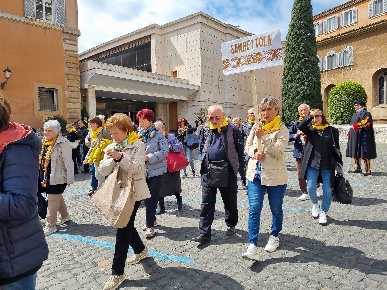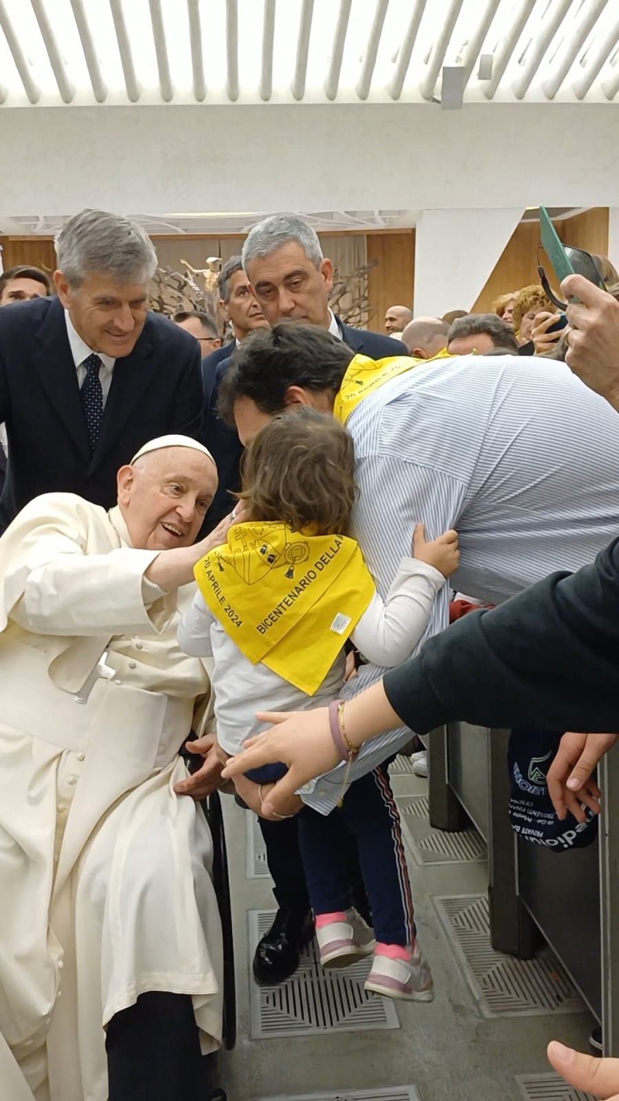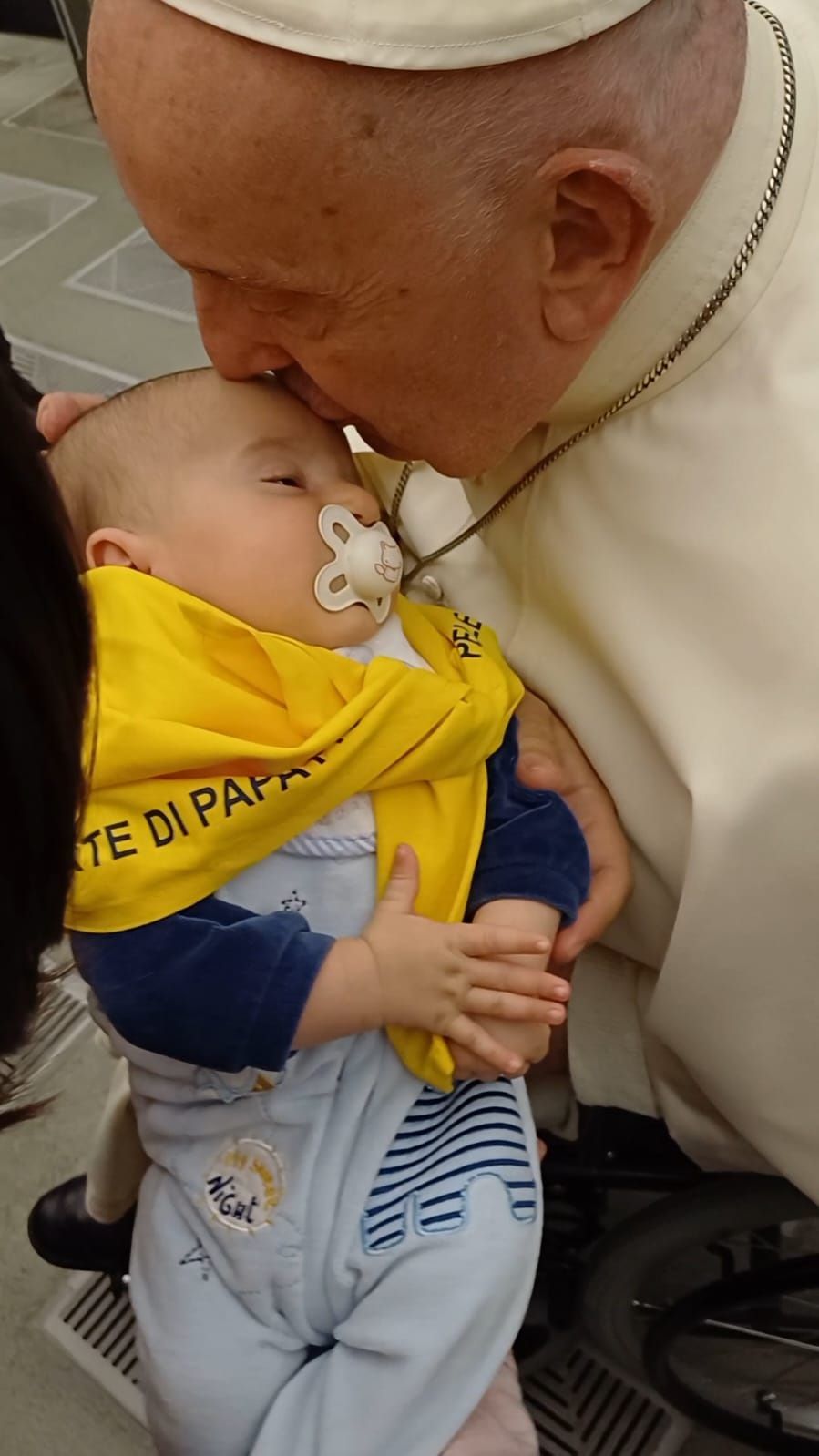 Quando il Pontefice ha fatto il giro lungo la balaustra, Samuele si è sporto oltre le transenne e ha presentato il piccolo al Pontefice che si è fermato e ha benedetto e baciato Riccardo, cui i genitori avevano messo il fazzolettone giallo del pellegrinaggio al collo, come si vede nelle foto qui sotto.