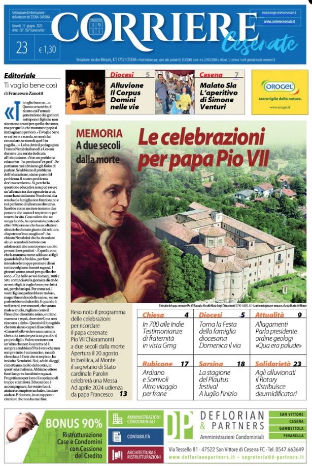 Sul Corriere Cesenate n. 23 in edicola e nelle case degli abbonati da domani, giovedì 15 giugno, dedichiamo la prima pagina e un approfondimento alle celebrazioni per papa Pio VII.