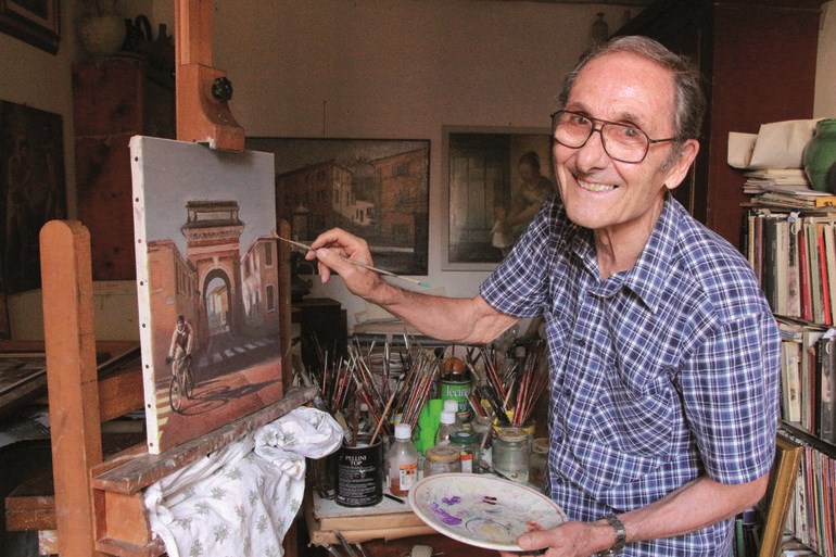 Adelmo Calderoni è nato a Russi nel 1936, ma può essere considerato cesenate d’adozione. Dopo aver studiato al Liceo artistico di Ravenna, ha abitato a Cesena dal 1972, dopo aver vinto la cattedra al Liceo scientifico “Augusto Righi” dove ha insegnato disegno e storia dell’arte fino al 1995. Ha svolto intensa attività come pittore e acquarellista, riscuotendo ampia notorietà in particolare come autore di grandi pale d’altare oggi presenti in diversi edifici di culto cittadini. Dopo la morte nel 2021, è stato ricordato con una doppia esposizione intitolata La buona pittura, a cura di Orlando Piraccini, all’Abbazia della Madonna del Monte e all’Officina dell’Arte di Cesena.